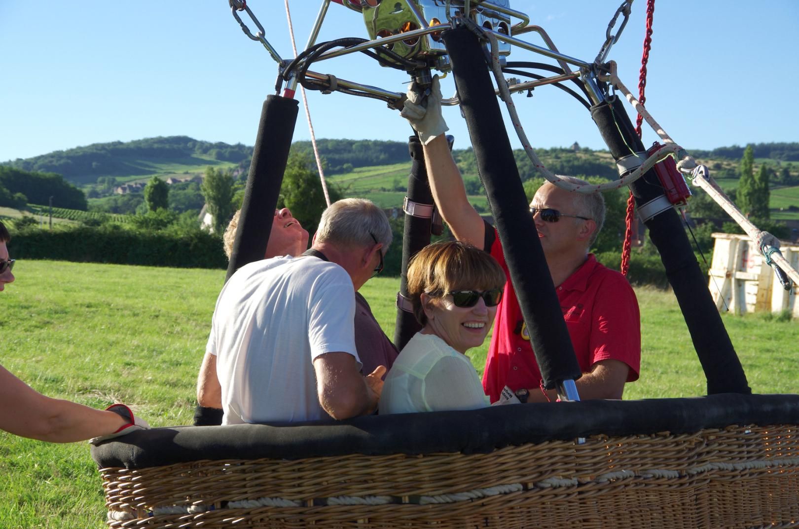 Une promenade en décapotable plutôt qu'en autocar!!! La nacelle de notre montgolfière n'emporte que 4 clients... Convivialité garantie.